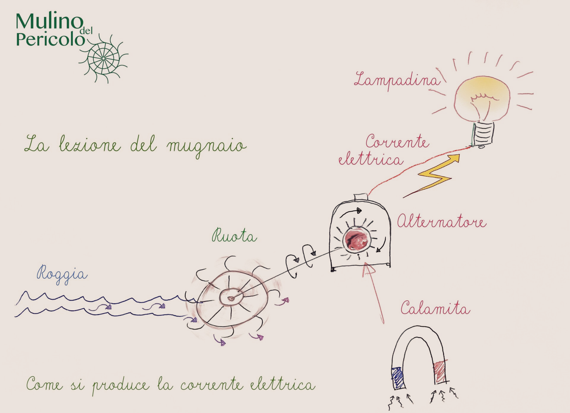 Produciamo energia pulita con l'impianto idroelettrico collegato alla ruota del Mulino.
